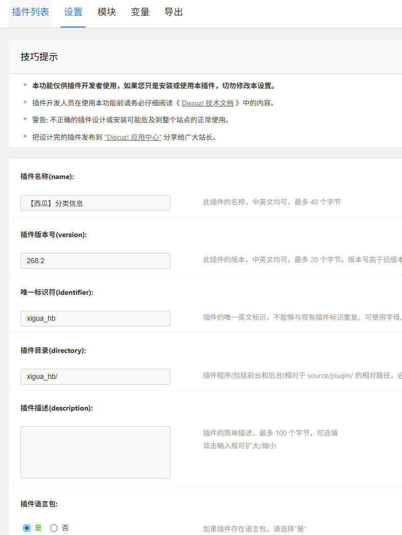 | 模板语言包 | identifier.lang.php (开发期用) | yourplugin.lang.php |