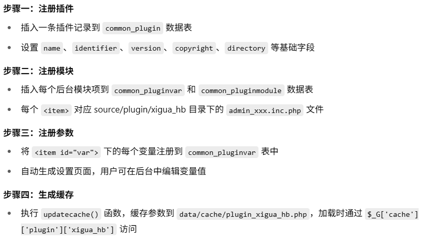 Discuz! 插件是一套 高集成度、低侵入性 的扩展机制,适用于功能模块的新增、模板的扩展、数据库的操作和前后台页面的增强。插件开发的标准步骤如下: