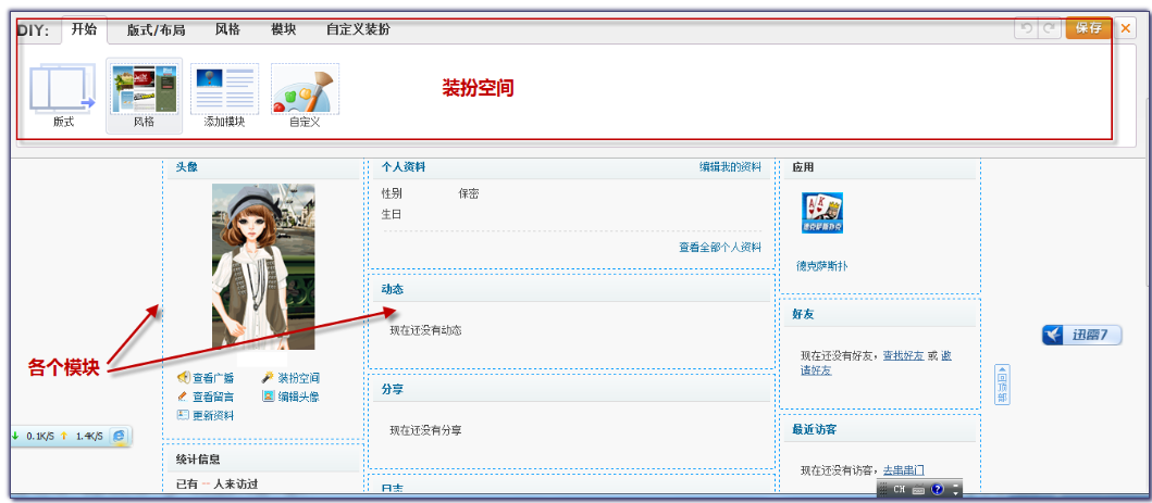 - 个人空间类似于QQ空间,用户可以在此发表日志、上传图片、发布记录等。