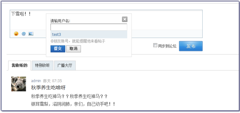 - 系统吸收微博优点为论坛所用,新增广播、关注、@好友、评论回流等功能。