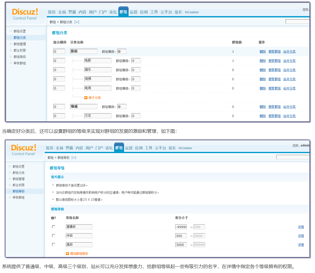 - 站长可以根据自己社区的运营情况,先设计好群组要开设哪些分类、等级,在后台做好设置。