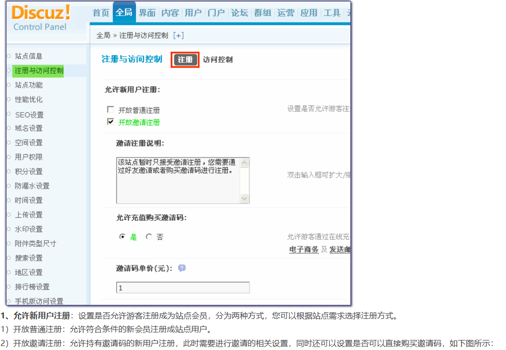 1. 注册相关设置:操作路径:【后台】=>【全局】=>【注册与访问控制】=>【注册】