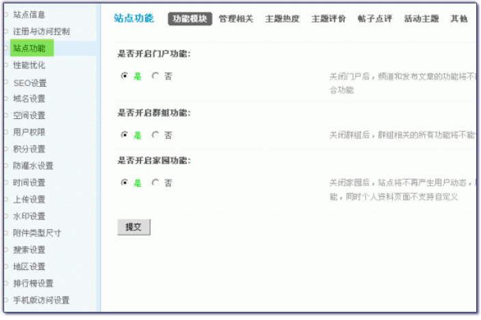 - 站点功能可以对站点的功能模块门户、群组和家园关闭和开启;管理统计、评价、点评和帖子内容以及活动主题进行一些基本的管理操作,功能包括功能模块、管理相关、主题热度、主题评价、帖子点评、活动主题和其他的一些基本操作。
