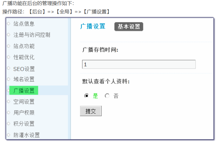通过空间设置可以对空间中的动态保留天数、首页动态显示数、热点推荐的天数范围、首页动态默认标签设置、默认记录提示内容、广播相关的设置等进行一系列基本的设置,同时还可以对新用户默认隐私设置,如:个人空间首页、好友列表、留言板、动态、记录等项的隐私设置。
