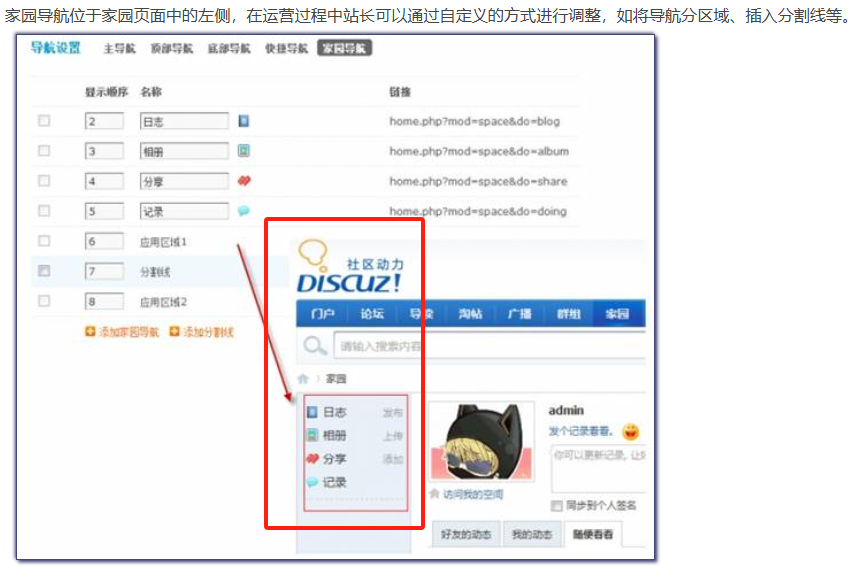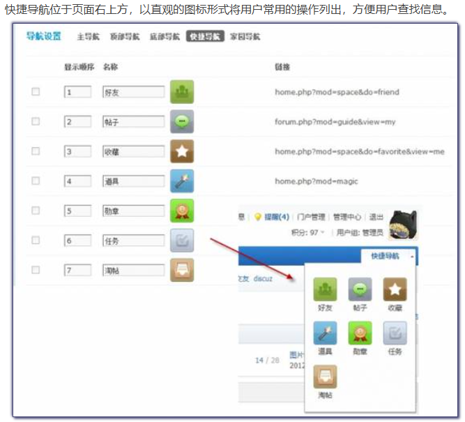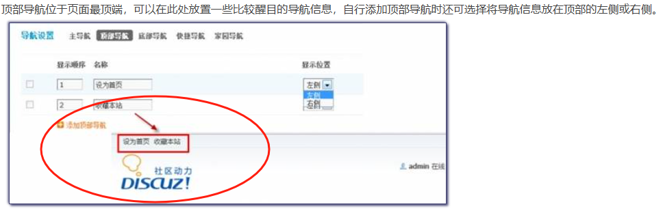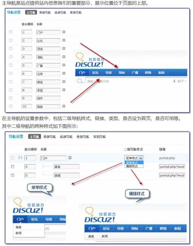 Discuz! X2.5 中的导航分为五个部分,分别是主导航、顶部导航、底部导航、快捷导航及家园导航。- 主导航
