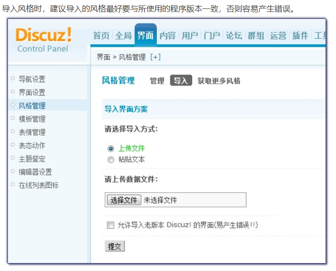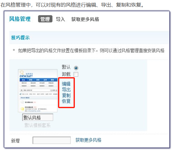 站长通过风格管理,可以设置论坛的默认风格;也可以调整正在使用中的风格配色,包括页面的颜色、背景等显示;还可以修改字体的大小等;同时还可以导入自己下载下来的风格、导出已有的风格。操作路径:【后台】=>【界面】=>【风格管理】