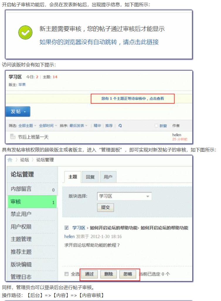 对于论坛的特定版块,管理者可能不希望会员发表的主题或回复直接显示出来,而是必须通过管理者的审核后,这些主题或者回复才能显示。 - 审核帖子功能的使用