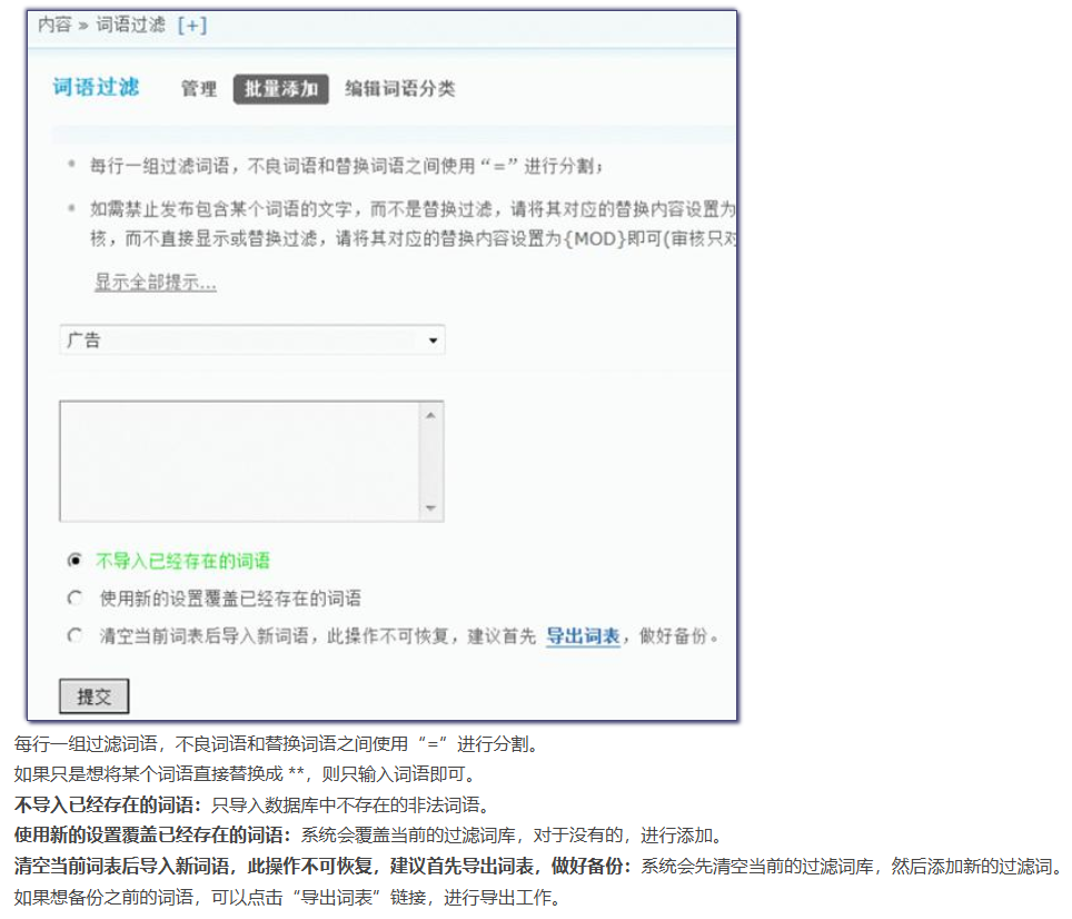 可以为词语过滤添加不同的分类名称,以区别不同的用途,方便管理,如政治类、广告类、恶意灌水类等,根据自己的站点情况随时增加或者删除。 - 管理不良词语
