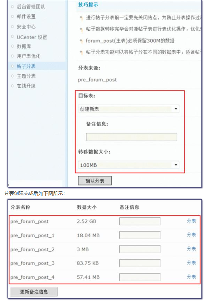第一次访问帖子分表功能,会看到默认拥有一个主表,名称为 pre_forum_post,此表为安装 Discuz! 后的标准帖子表。新添加的表会自动以“pre_forum_post_数字”的方式进行命名,无需人工干预。