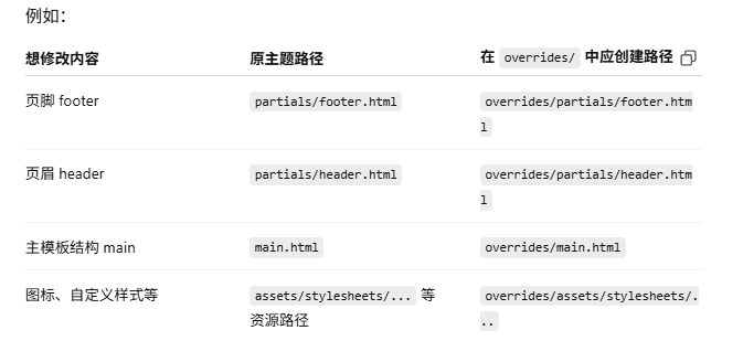 custom_dir 时,overrides/ 目录下的结构必须严格模拟官方主题的文件结构。也就是说:如果你希望修改主题的某个文件,就需要在 overrides/ 中使用相同路径和文件名创建一个副本,系统会自动使用该副本替换原文件。例如: