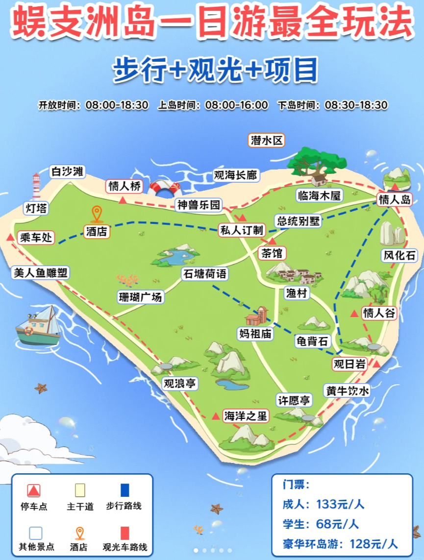 - 出发建议:08:00 从酒店出发,约25分钟车程抵达蜈支洲岛码头